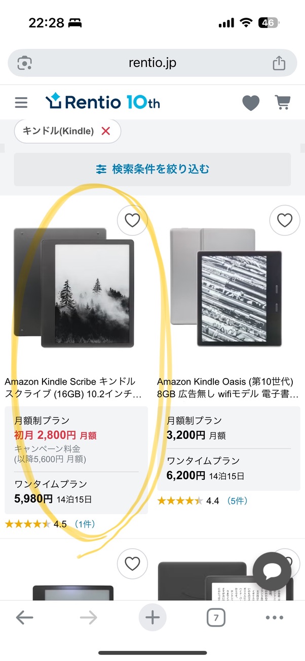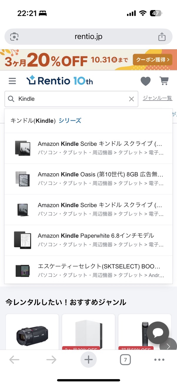 サイト上部の検索バーに「Kindle」と入力して検索。レンタル可能な端末一覧が表示されます。