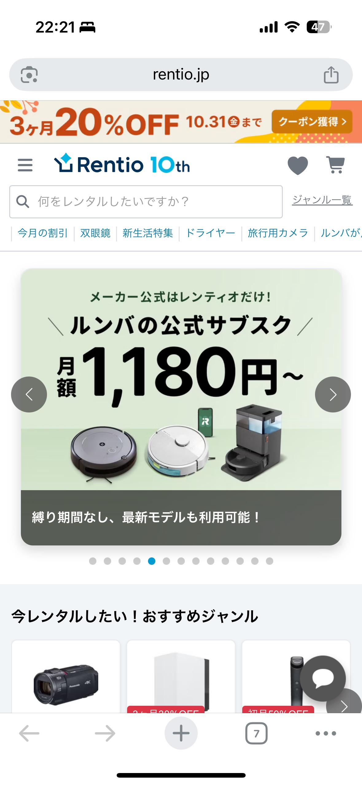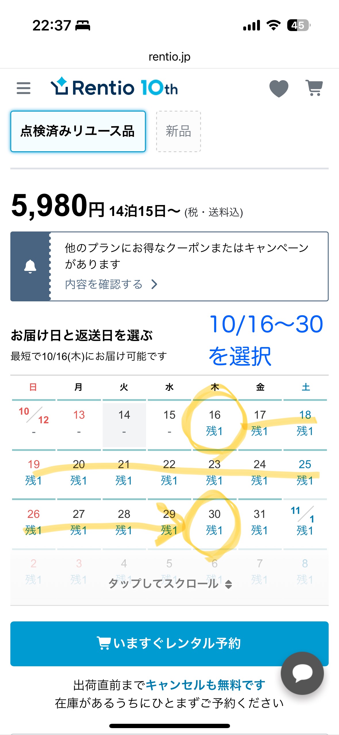 Rentioでは初回レンタルの方対象に限定クーポンを配布しています。基本は500円引きなのですが、なんと今だけ4,000円オフのクーポンが発行されています。(〜2025年11月20日まで!)