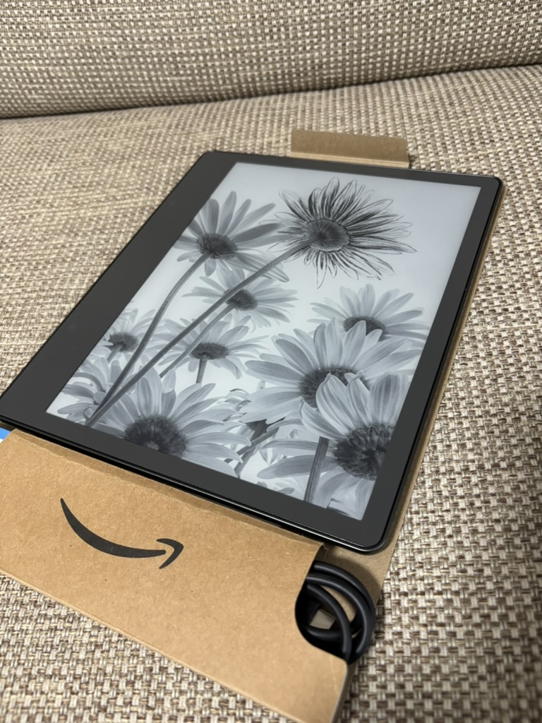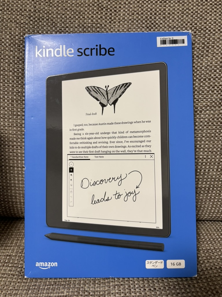 こちらは実際に手元に届いた Kindle Scribe。点検済みリユース品とのことで箱は若干使用感がありましたが、