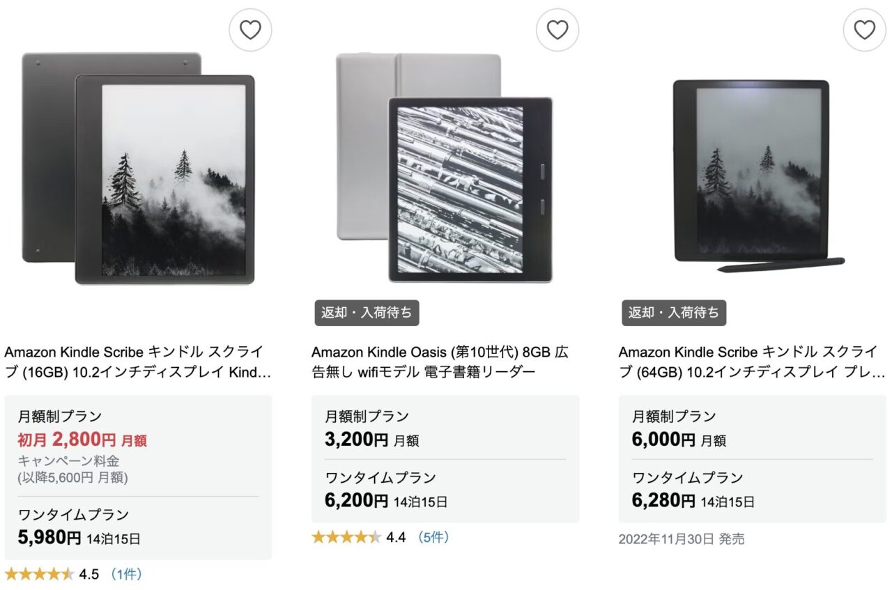 電子書籍端末に限りませんが、話題の家電はすでに貸し出し中ということも。KindleならPaperwhiteやOasisなど人気モデルは、在庫切れが頻発します。